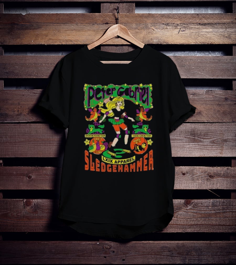 Peter Gabriel Sledgehammer Lxix Apparel Show Me Round Your House Shirt made from 100% pre-shrunk ring-spun cotton, unisex regular fit based on U.S. standard sizing. The shirt is designed, cut, sewn, and printed in the United States. Available in sizes S-5XL.