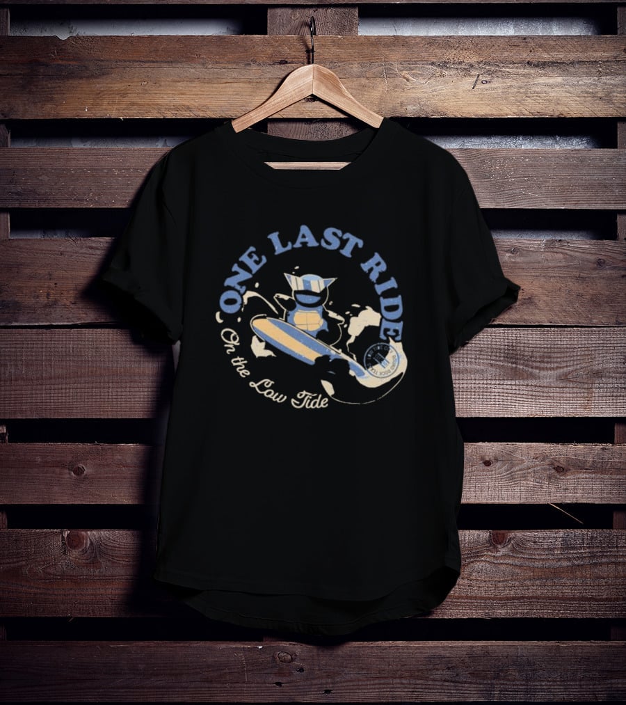 Surfing Adventure With Blue Masked Figure And Iconic Board 'One Last Ride On The Low Tide' T-Shirt