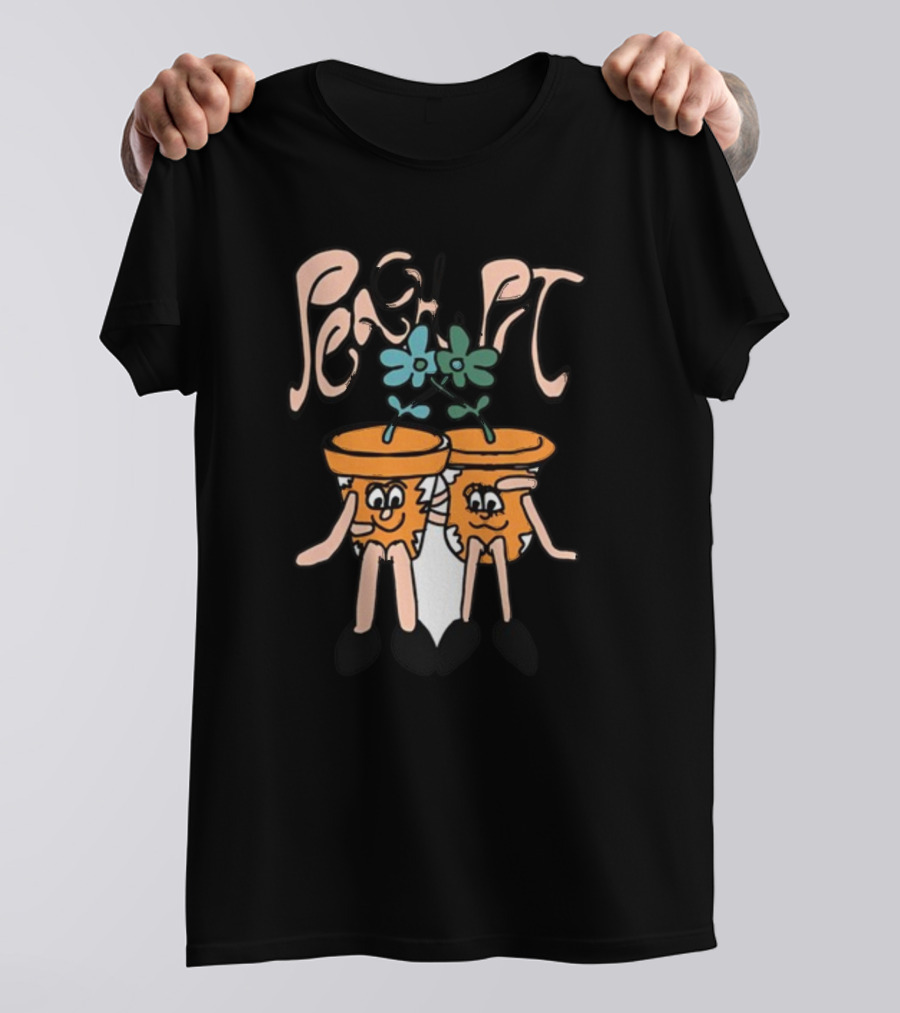 Peach Pit Dancing Flower Pots Duo Playful Cartoon Typography Shirt made from 100% pre-shrunk ring-spun cotton, unisex regular fit based on U.S. standard sizing. The shirt is designed, cut, sewn, and printed in the United States. Available in sizes S-5XL.