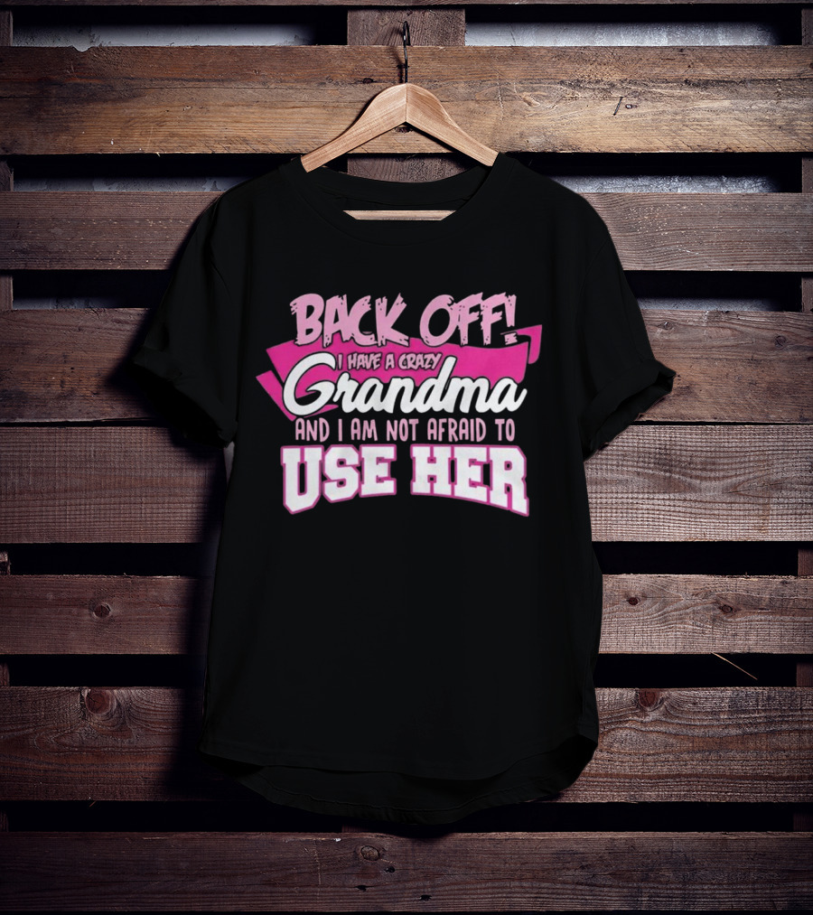 Back Off I Have a Crazy Grandma and I Am Not Afraid to Use Her Shirt made from 100% pre-shrunk ring-spun cotton, unisex regular fit based on U.S. standard sizing. The shirt is designed, cut, sewn, and printed in the United States. Available in sizes S-5XL.
