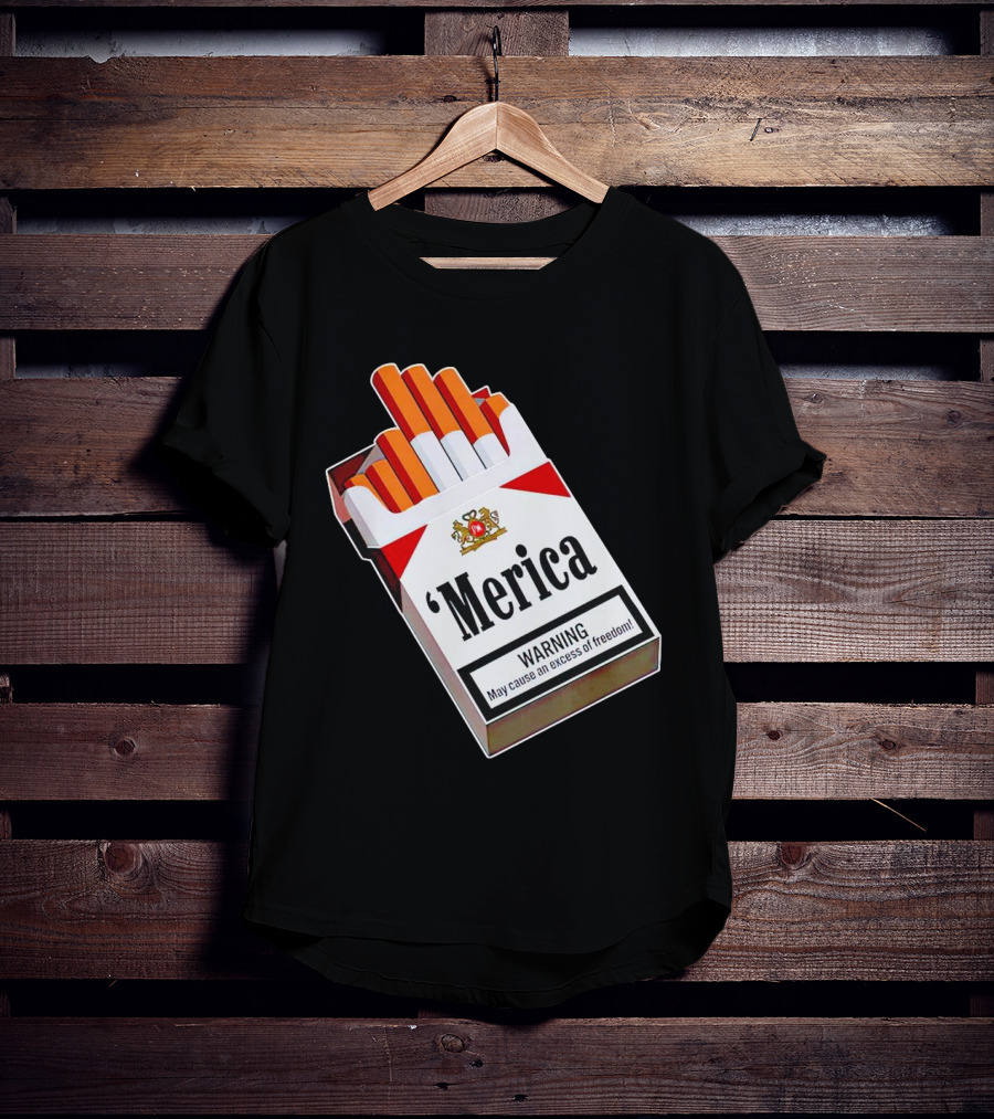 Merica Marlboro Warning Excess of Freedom Shirt made from 100% pre-shrunk ring-spun cotton, unisex regular fit based on U.S. standard sizing. The shirt is designed, cut, sewn, and printed in the United States. Available in sizes S-5XL.