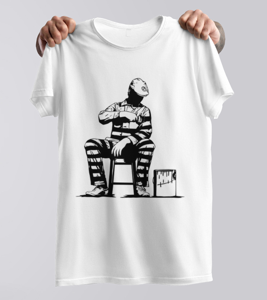 Dolk Prison Painter Sits with Paint Bucket Shirt made from 100% pre-shrunk ring-spun cotton, unisex regular fit based on U.S. standard sizing. The shirt is designed, cut, sewn, and printed in the United States. Available in sizes S-5XL.