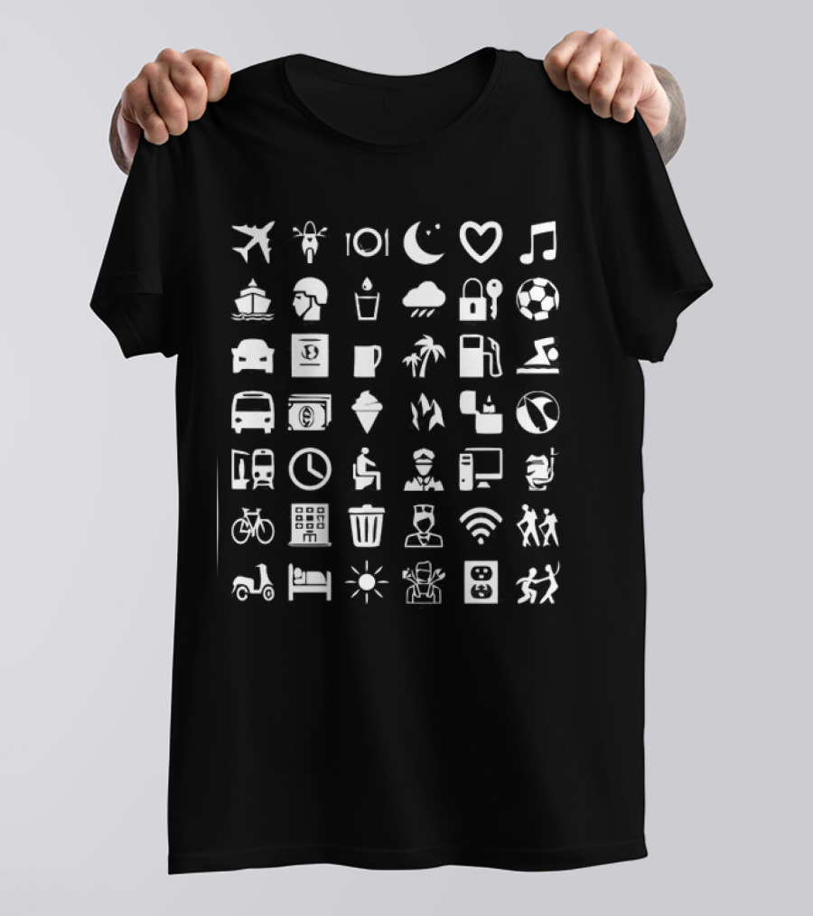 Symbol Travel Icons Airplane Music Bicycle Coffee Mug WiFi Soccer Bed Scooter Sun Plug Adventure Shirt made from 100% pre-shrunk ring-spun cotton, unisex regular fit based on U.S. standard sizing. The shirt is designed, cut, sewn, and printed in the United States. Available in sizes S-5XL.