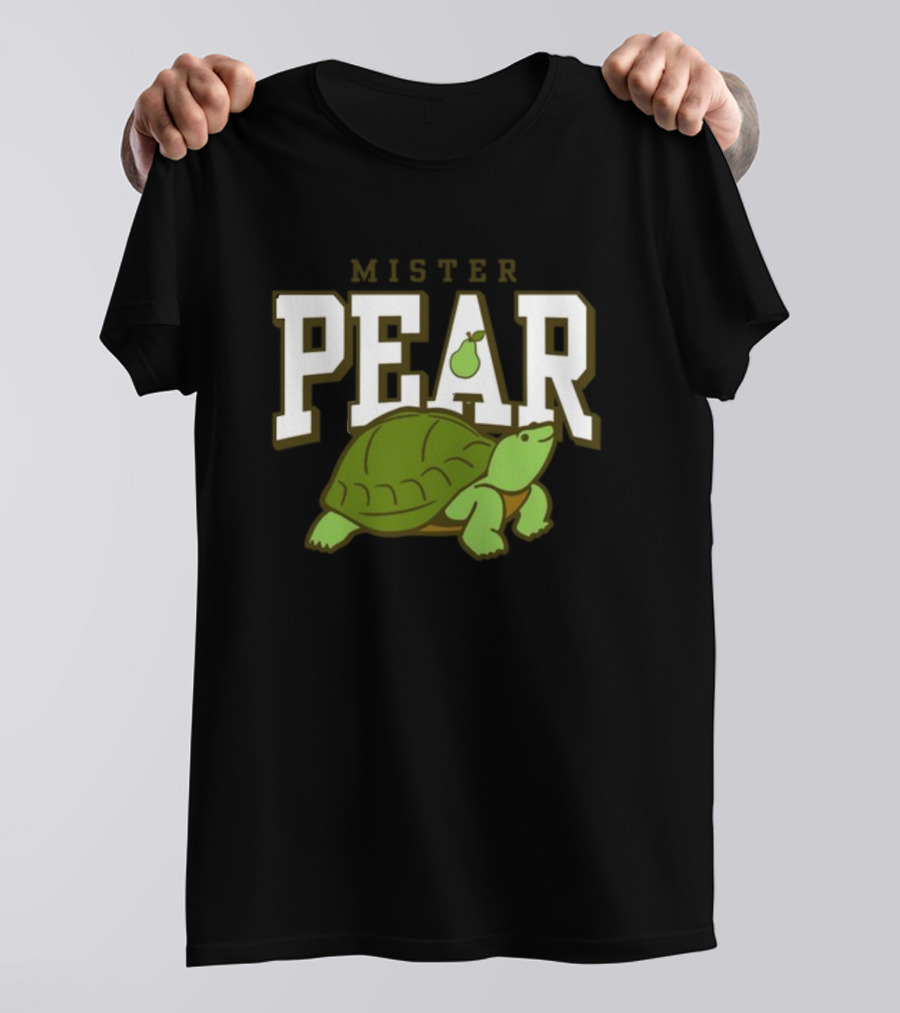 Mister Pear Turtle Varsity Shirt made from 100% pre-shrunk ring-spun cotton, unisex regular fit based on U.S. standard sizing. The shirt is designed, cut, sewn, and printed in the United States. Available in sizes S-5XL.
