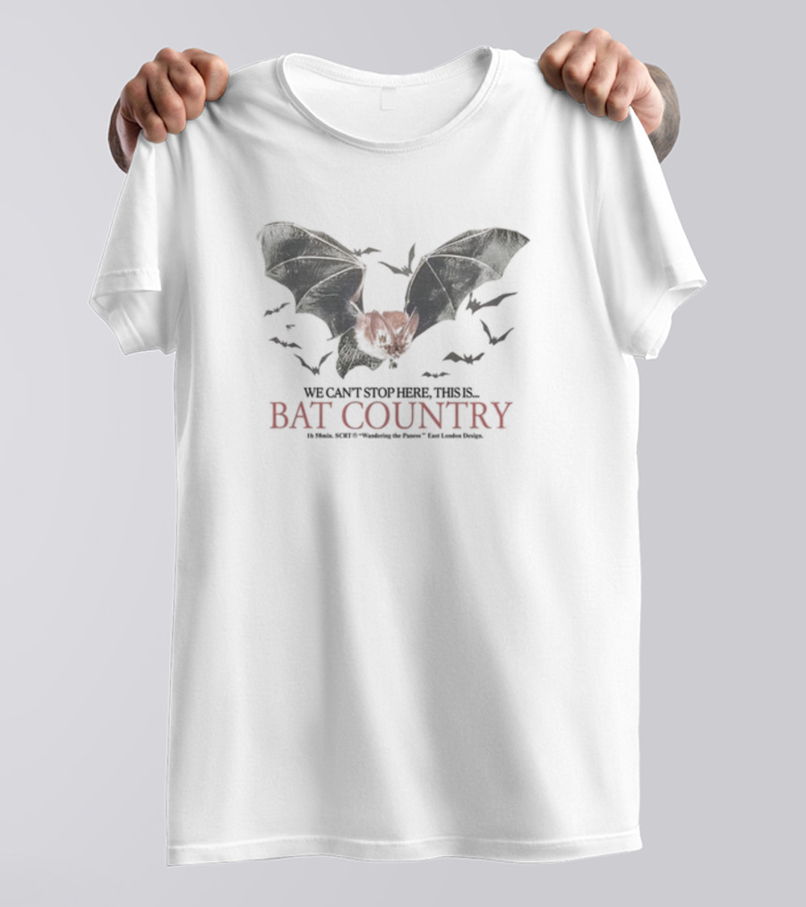 We Can't Stop Here This Is Bat Country Fear Loathing Las Vegas Bats Hunter S. Thompson Shirt made from 100% pre-shrunk ring-spun cotton, unisex regular fit based on U.S. standard sizing. The shirt is designed, cut, sewn, and printed in the United States. Available in sizes S-5XL.