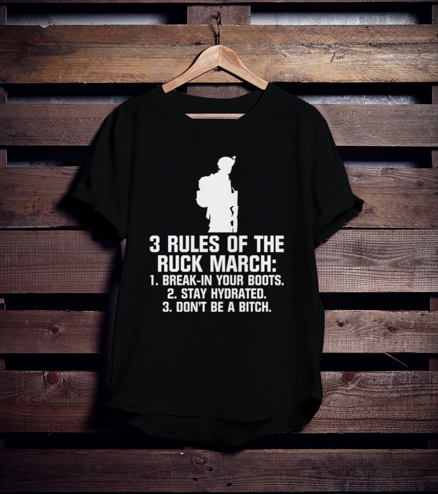 3 Rules of the Ruck March Break-In Your Boots Stay Hydrated Don't Be a Bitch Shirt made from 100% pre-shrunk ring-spun cotton, unisex regular fit based on U.S. standard sizing. The shirt is designed, cut, sewn, and printed in the United States. Available in sizes S-5XL.