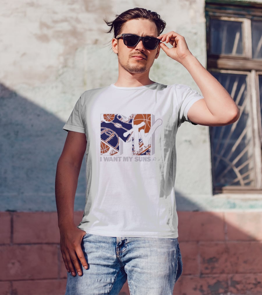 I Want My Suns MTV Phoenix Basketball Shirt made from 100% pre-shrunk ring-spun cotton, unisex regular fit based on U.S. standard sizing. The shirt is designed, cut, sewn, and printed in the United States. Available in sizes S-5XL.