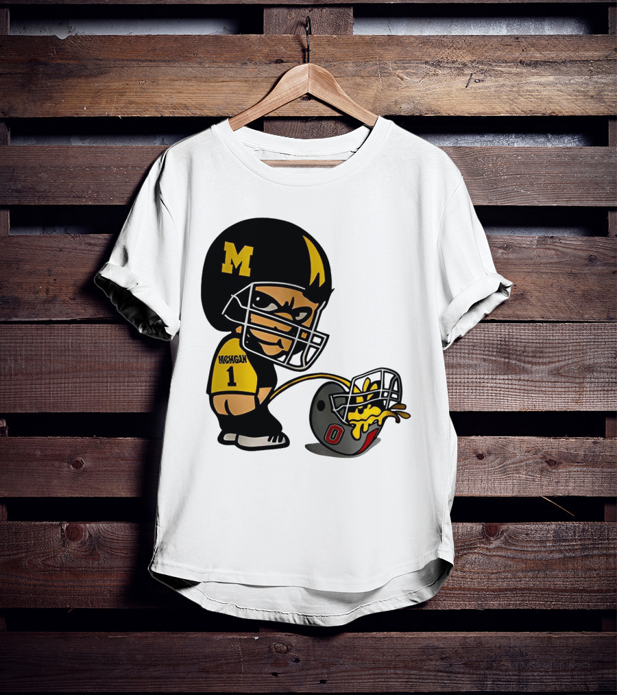 Michigan Wolverines M Football Player Pissing on Ohio State Helmet with O Shirt made from 100% pre-shrunk ring-spun cotton, unisex regular fit based on U.S. standard sizing. The shirt is designed, cut, sewn, and printed in the United States. Available in sizes S-5XL.