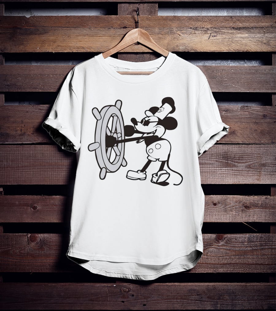 Steamboat Willie Mickey Mouse Pirate Steering Wheel Shirt made from 100% pre-shrunk ring-spun cotton, unisex regular fit based on U.S. standard sizing. The shirt is designed, cut, sewn, and printed in the United States. Available in sizes S-5XL.