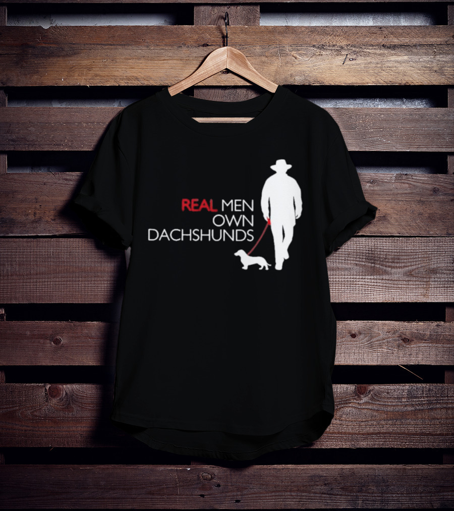 REAL MEN OWN DACHSHUNDS Walking Shirt made from 100% pre-shrunk ring-spun cotton, unisex regular fit based on U.S. standard sizing. The shirt is designed, cut, sewn, and printed in the United States. Available in sizes S-5XL.