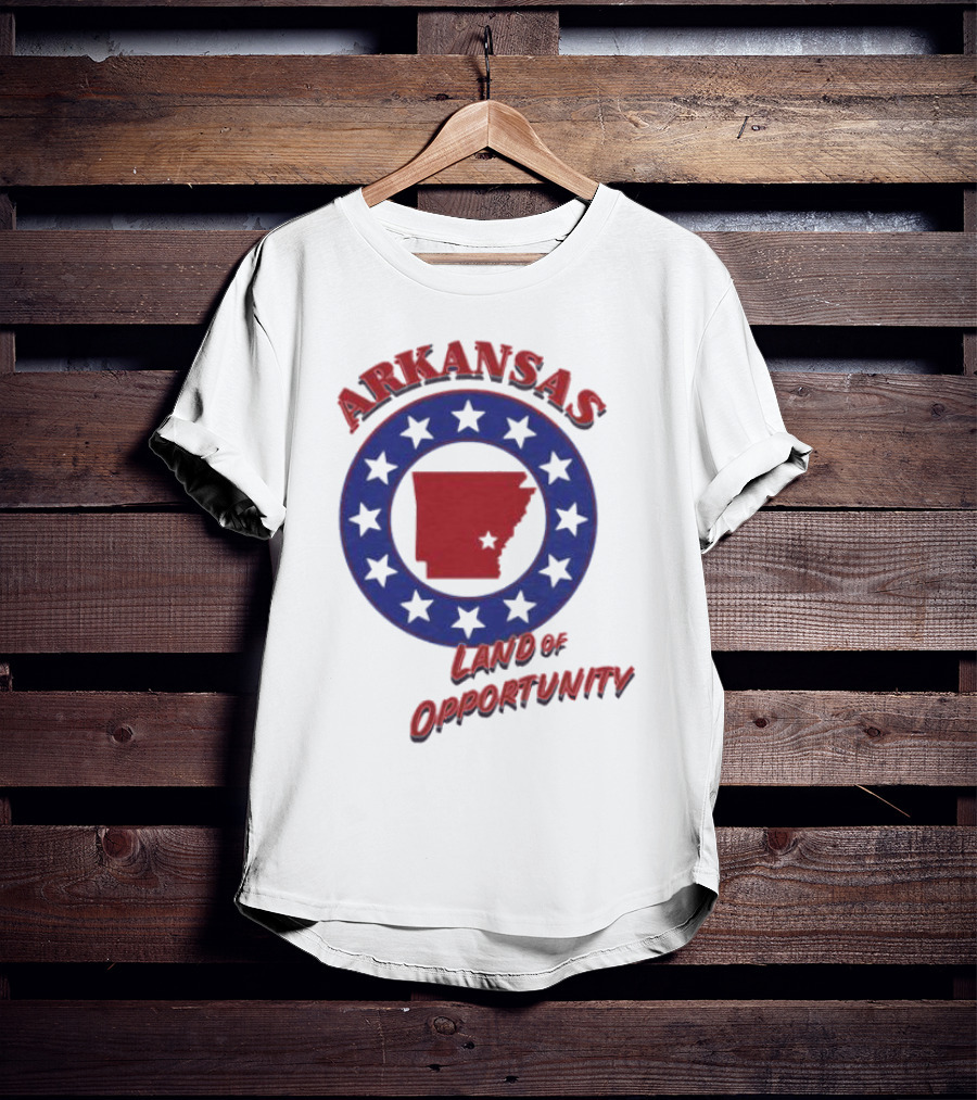 Arkansas Land of Opportunity Red State Blue Star Circle Shirt made from 100% pre-shrunk ring-spun cotton, unisex regular fit based on U.S. standard sizing. The shirt is designed, cut, sewn, and printed in the United States. Available in sizes S-5XL.
