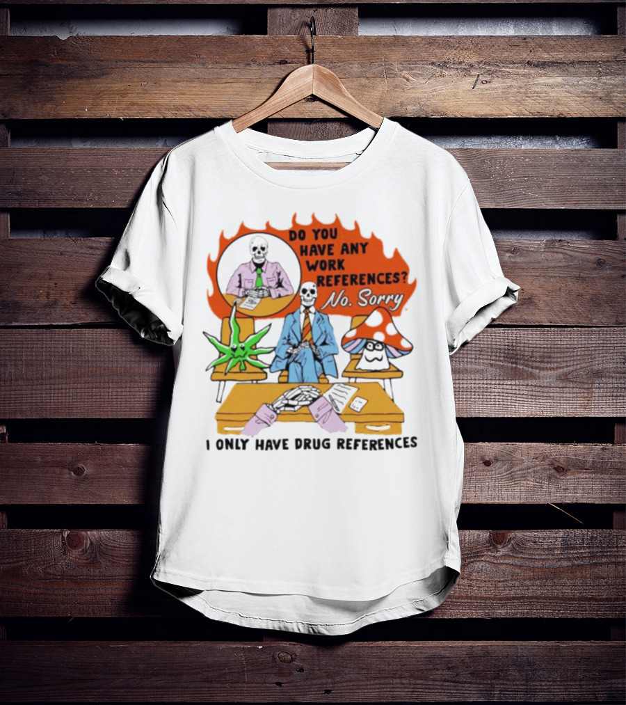 Do You Have Any Work References No Sorry I Only Have Drug References Shirt made from 100% pre-shrunk ring-spun cotton, unisex regular fit based on U.S. standard sizing. The shirt is designed, cut, sewn, and printed in the United States. Available in sizes S-5XL.