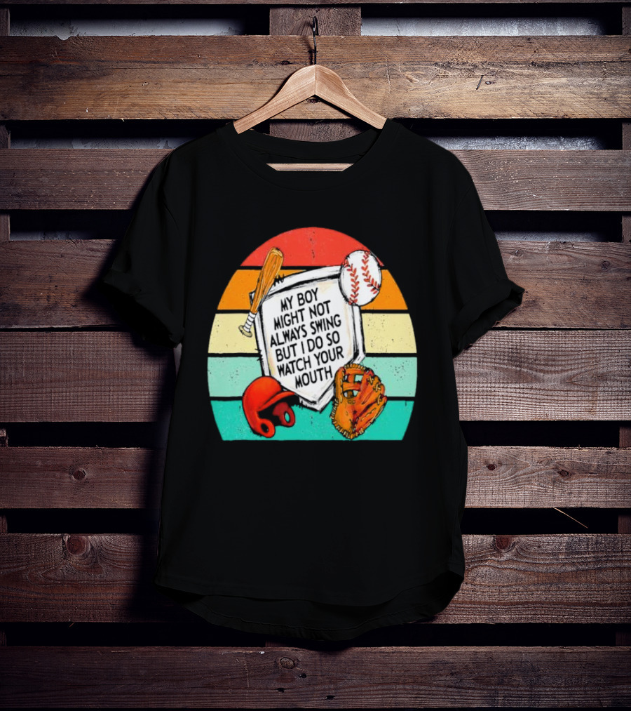 My Boy Might Not Always Swing But I Do Watch Your Mouth Vintage Baseball Bat Helmet Glove Retro Stripes T-Shirt