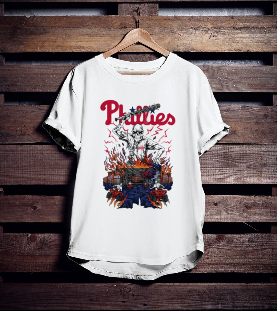 Phillies Ring the Bell Skeleton Flames Shirt made from 100% pre-shrunk ring-spun cotton, unisex regular fit based on U.S. standard sizing. The shirt is designed, cut, sewn, and printed in the United States. Available in sizes S-5XL.