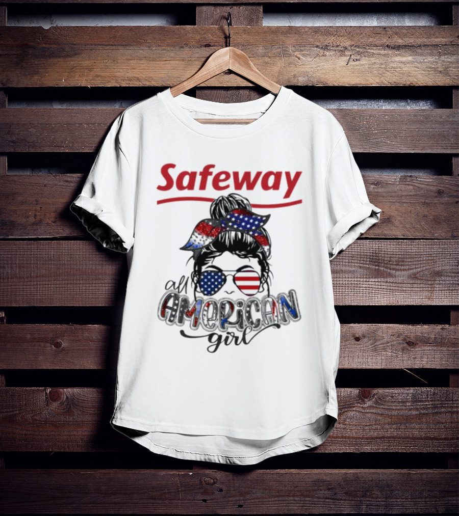 Safeway All American Girl Messy Bun Red White Blue Glasses Bandana Shirt made from 100% pre-shrunk ring-spun cotton, unisex regular fit based on U.S. standard sizing. The shirt is designed, cut, sewn, and printed in the United States. Available in sizes S-5XL.