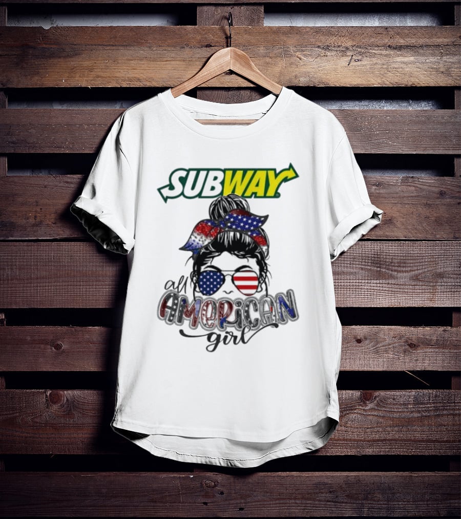 Subway All American Girl Messy Bun Patriotic Bandana and Sunglasses Shirt made from 100% pre-shrunk ring-spun cotton, unisex regular fit based on U.S. standard sizing. The shirt is designed, cut, sewn, and printed in the United States. Available in sizes S-5XL.
