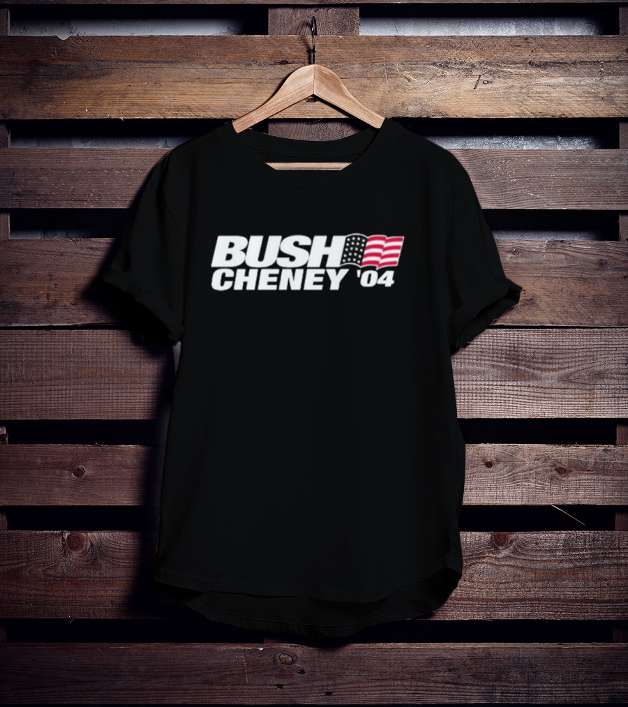 BUSH CHENEY '04 American Flag Shirt made from 100% pre-shrunk ring-spun cotton, unisex regular fit based on U.S. standard sizing. The shirt is designed, cut, sewn, and printed in the United States. Available in sizes S-5XL.