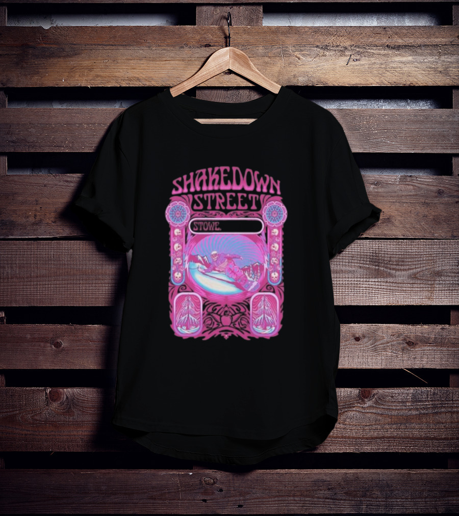 Shakedown Street Stowe Vermont Psychedelic Snowboarder Retro Shirt made from 100% pre-shrunk ring-spun cotton, unisex regular fit based on U.S. standard sizing. The shirt is designed, cut, sewn, and printed in the United States. Available in sizes S-5XL.