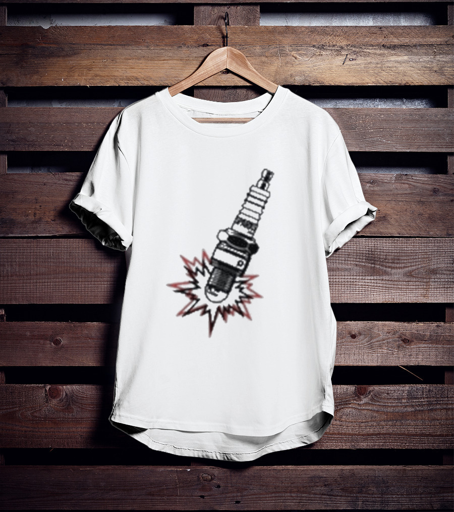 Sparks Plug Ignition Flash Shirt made from 100% pre-shrunk ring-spun cotton, unisex regular fit based on U.S. standard sizing. The shirt is designed, cut, sewn, and printed in the United States. Available in sizes S-5XL.