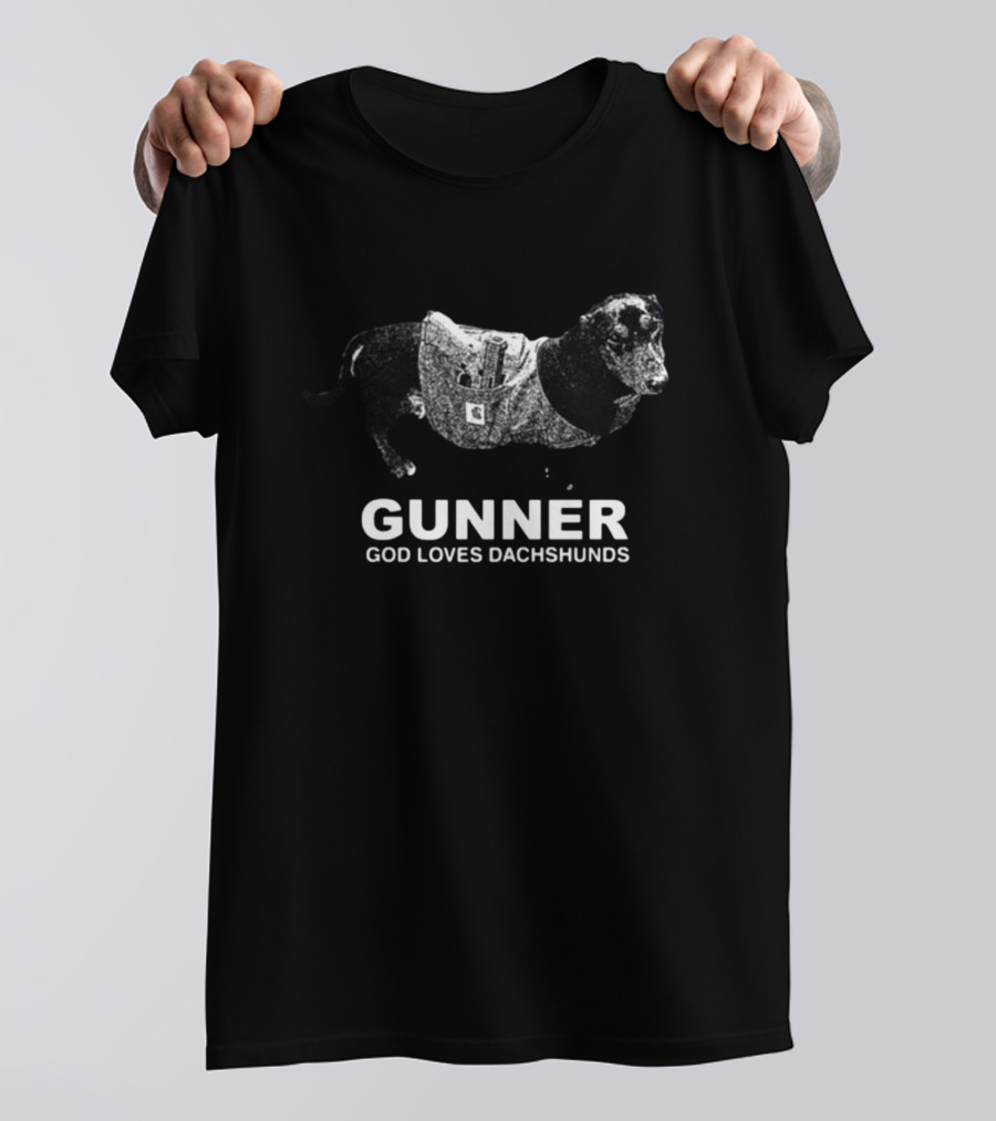 Gunner God Loves Dachshunds Dachshund in Tactical Vest Shirt made from 100% pre-shrunk ring-spun cotton, unisex regular fit based on U.S. standard sizing. The shirt is designed, cut, sewn, and printed in the United States. Available in sizes S-5XL.
