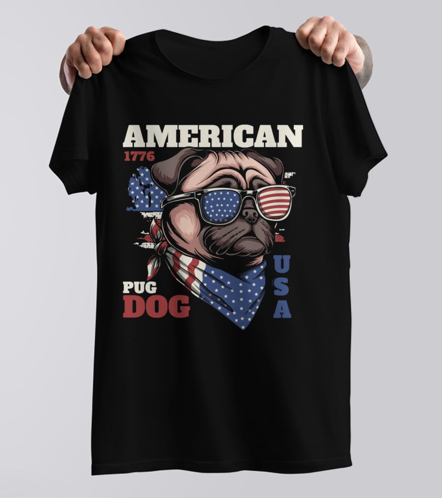 AMERICAN PUG DOG 1776 USA Shirt made from 100% pre-shrunk ring-spun cotton, unisex regular fit based on U.S. standard sizing. The shirt is designed, cut, sewn, and printed in the United States. Available in sizes S-5XL.
