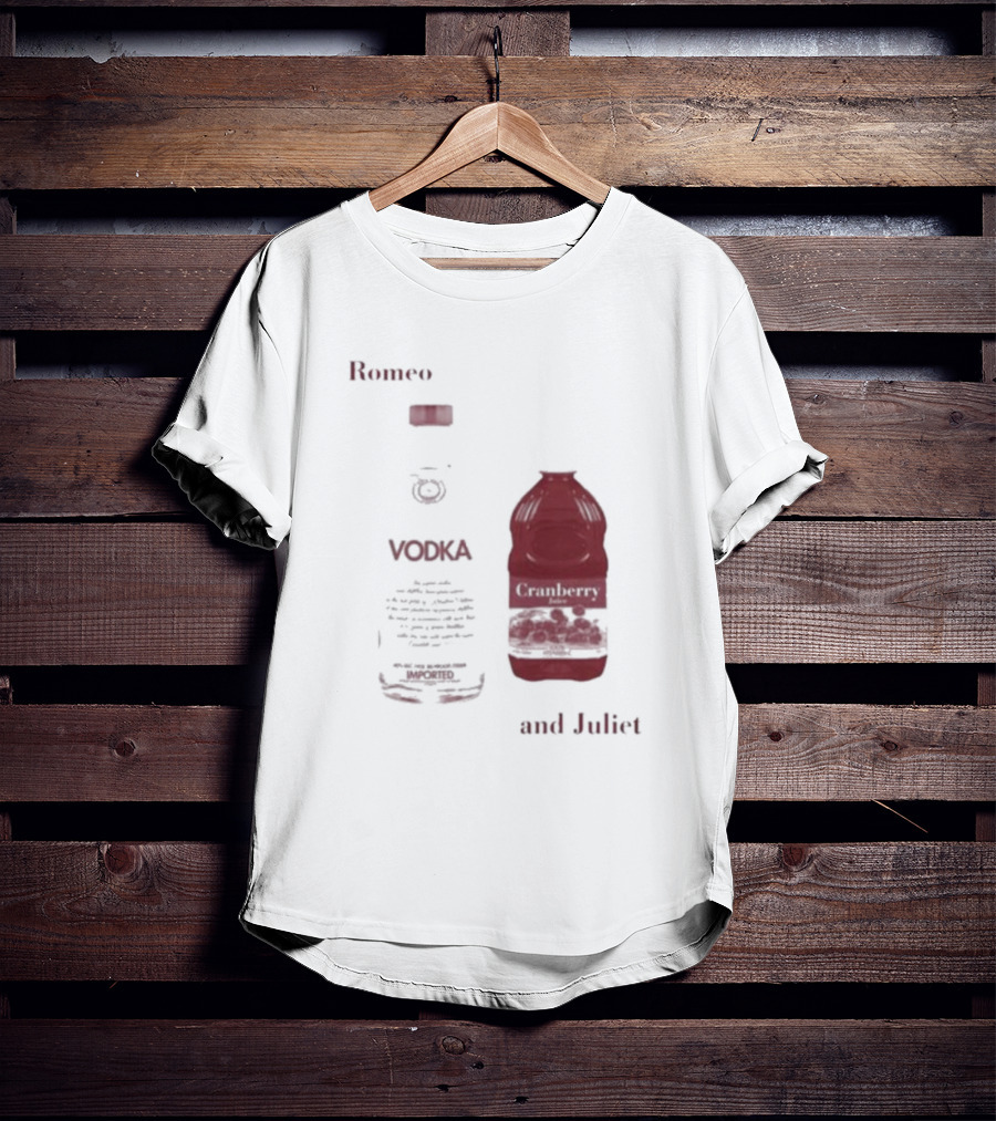 Romeo Vodka and Juliet Cranberry Shirt made from 100% pre-shrunk ring-spun cotton, unisex regular fit based on U.S. standard sizing. The shirt is designed, cut, sewn, and printed in the United States. Available in sizes S-5XL.