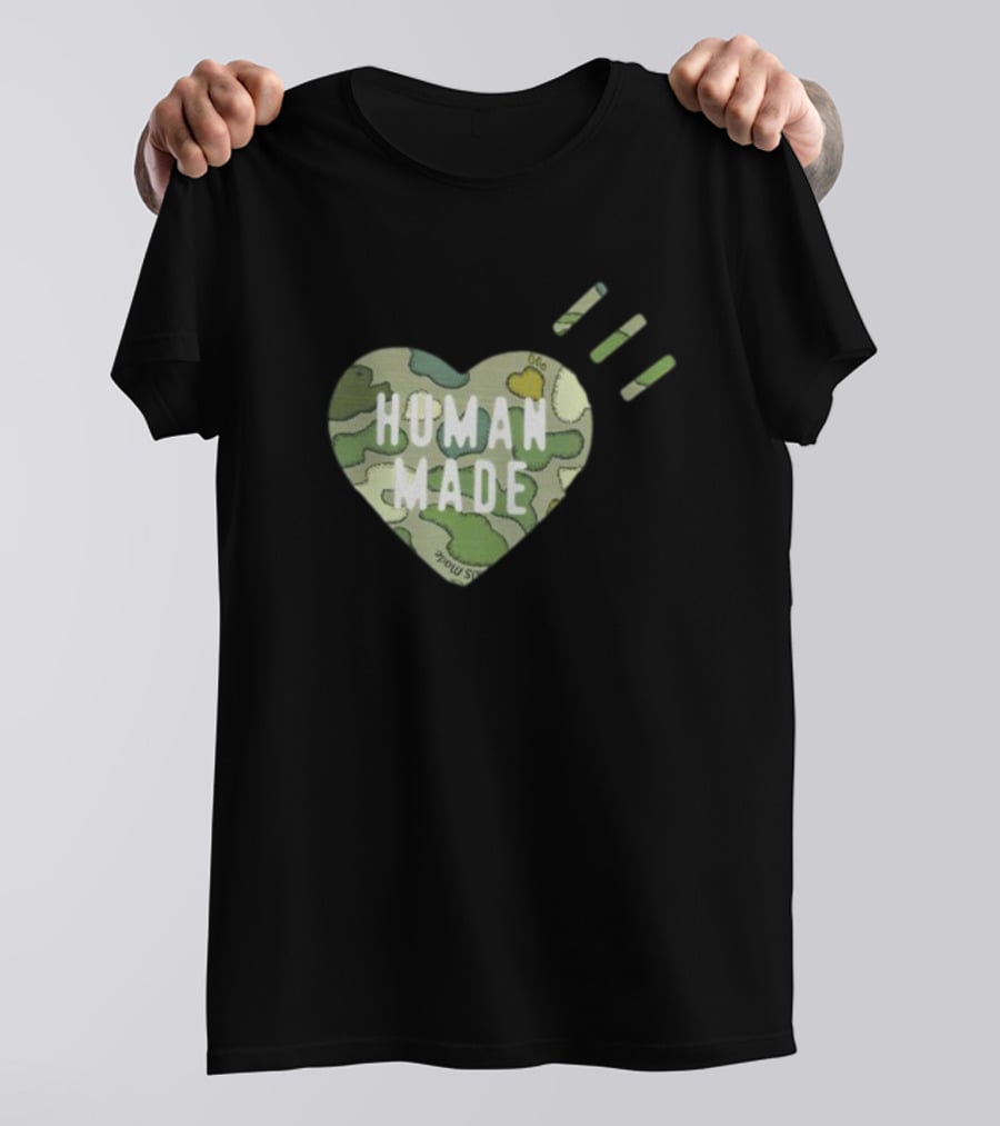 HUMAN MADE Camo Heart Kaws Collaboration Shirt made from 100% pre-shrunk ring-spun cotton, unisex regular fit based on U.S. standard sizing. The shirt is designed, cut, sewn, and printed in the United States. Available in sizes S-5XL.