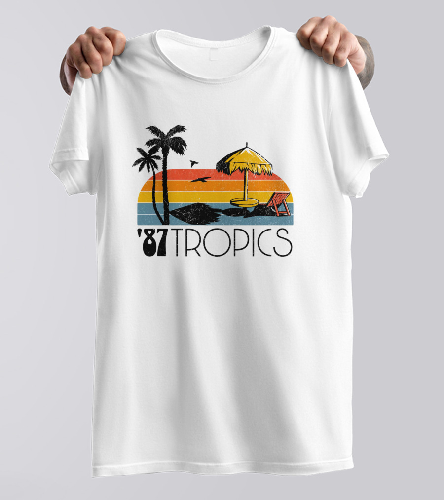 '87 Tropics Palm Beach Sunset Umbrella Lounge Chair Shirt made from 100% pre-shrunk ring-spun cotton, unisex regular fit based on U.S. standard sizing. The shirt is designed, cut, sewn, and printed in the United States. Available in sizes S-5XL.