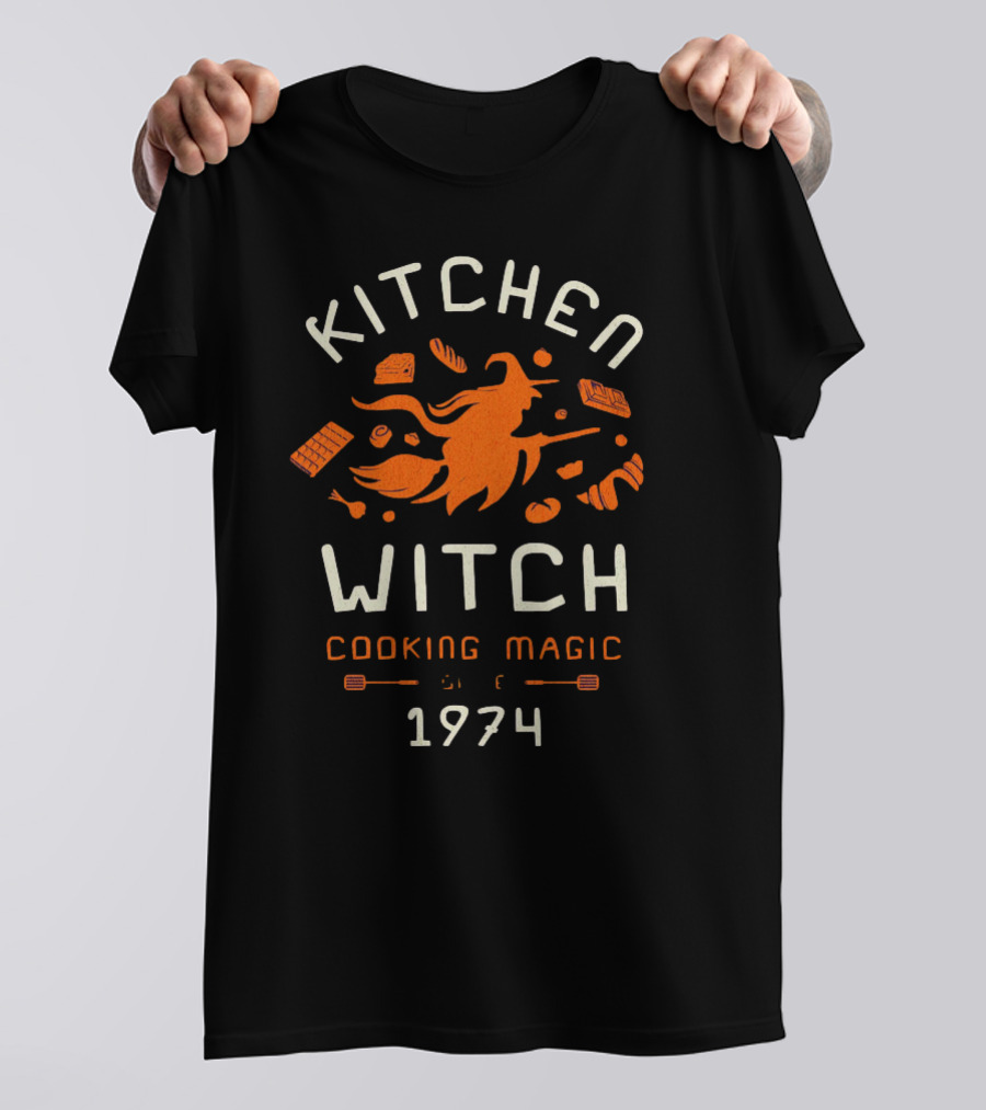 KITCHEN WITCH COOKING MAGIC 1974 Shirt made from 100% pre-shrunk ring-spun cotton, unisex regular fit based on U.S. standard sizing. The shirt is designed, cut, sewn, and printed in the United States. Available in sizes S-5XL.