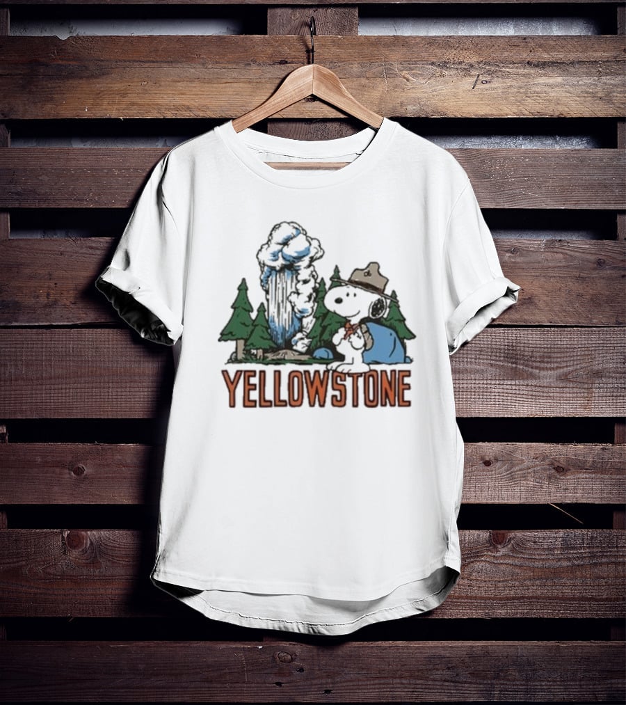 Peanuts Snoopy Yellowstone Camping Scene with Geyser and Forest Shirt made from 100% pre-shrunk ring-spun cotton, unisex regular fit based on U.S. standard sizing. The shirt is designed, cut, sewn, and printed in the United States. Available in sizes S-5XL.