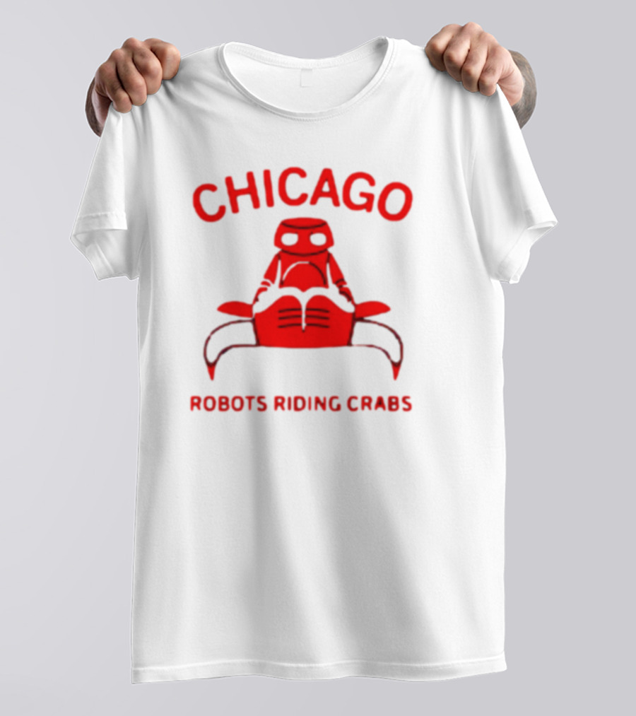 Chicago Robots Riding Crabs Shirt made from 100% pre-shrunk ring-spun cotton, unisex regular fit based on U.S. standard sizing. The shirt is designed, cut, sewn, and printed in the United States. Available in sizes S-5XL.