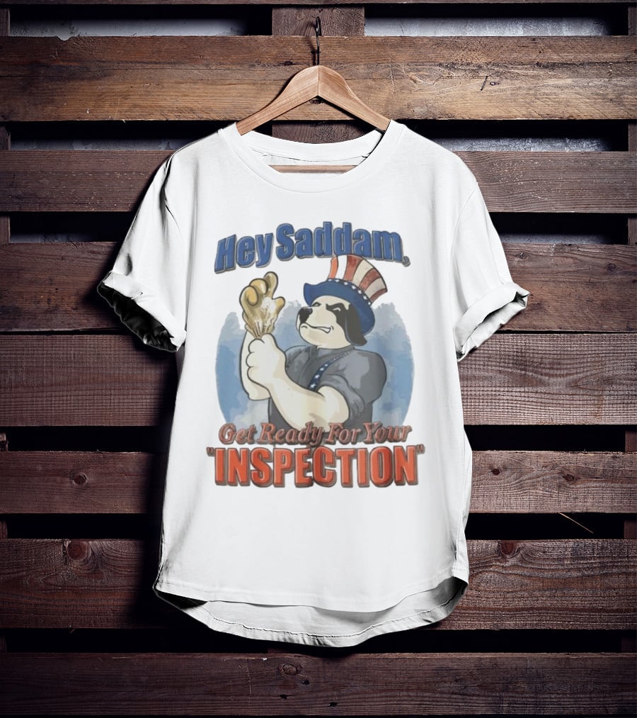 Hey Saddam Get Ready For Your Inspection Uncle Sam Dog Boxer Glove Shirt made from 100% pre-shrunk ring-spun cotton, unisex regular fit based on U.S. standard sizing. The shirt is designed, cut, sewn, and printed in the United States. Available in sizes S-5XL.