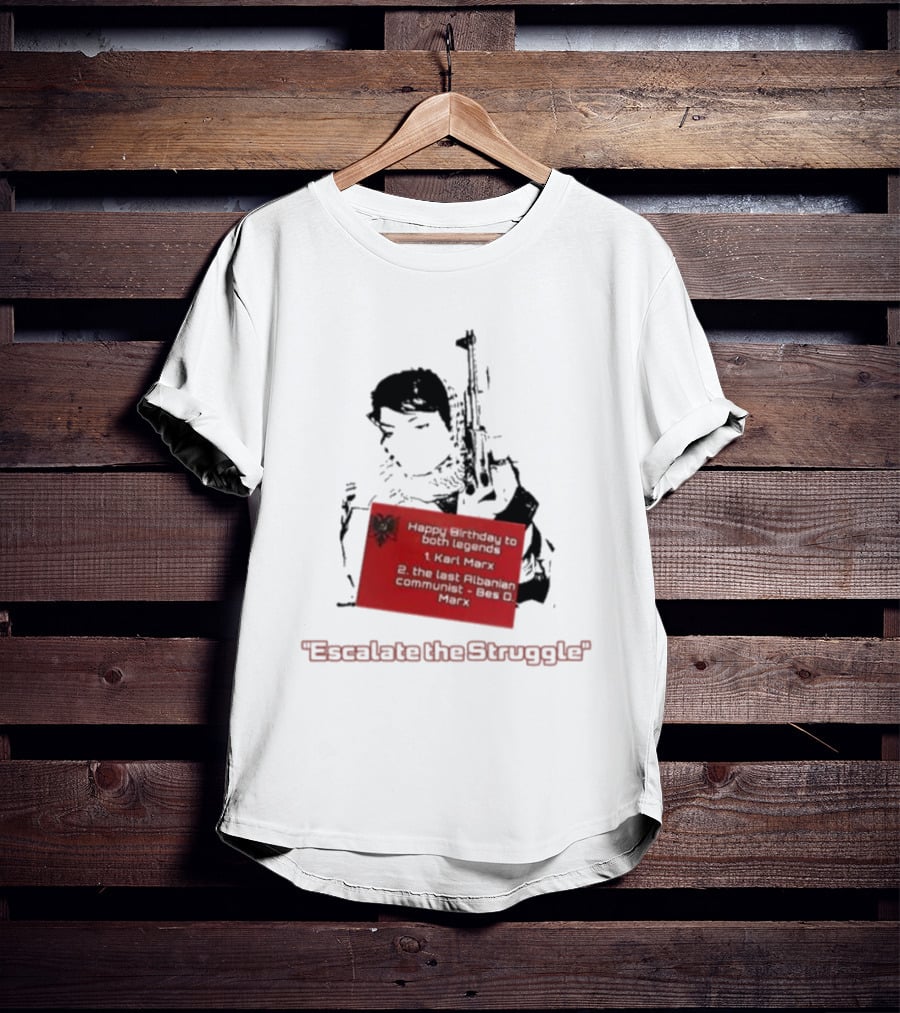 Happy Birthday to Both Legends: 1. Karl Marx 2. The Last Albanian Communist Beq O. Mark Escalate The Struggle Shirt made from 100% pre-shrunk ring-spun cotton, unisex regular fit based on U.S. standard sizing. The shirt is designed, cut, sewn, and printed in the United States. Available in sizes S-5XL.
