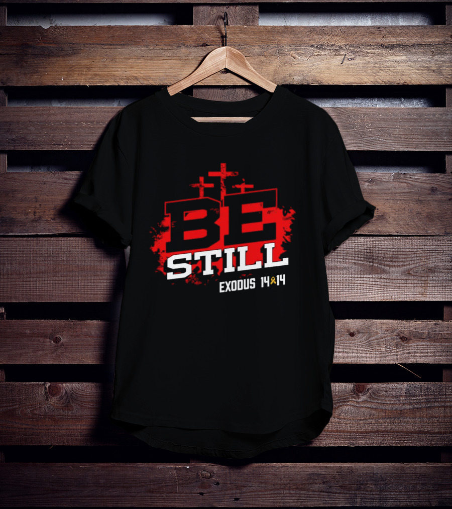 Be Still Exodus 14 14 Charity Jake Fraley Shirt made from 100% pre-shrunk ring-spun cotton, unisex regular fit based on U.S. standard sizing. The shirt is designed, cut, sewn, and printed in the United States. Available in sizes S-5XL.
