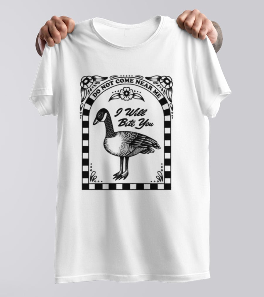 Renographics Do Not Come Near Me I Will Bite You Goose Floral Border Shirt made from 100% pre-shrunk ring-spun cotton, unisex regular fit based on U.S. standard sizing. The shirt is designed, cut, sewn, and printed in the United States. Available in sizes S-5XL.