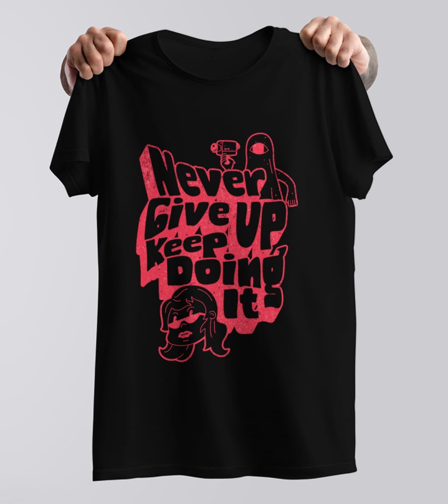 Never Give Up Keep Doing It Shirt made from 100% pre-shrunk ring-spun cotton, unisex regular fit based on U.S. standard sizing. The shirt is designed, cut, sewn, and printed in the United States. Available in sizes S-5XL.