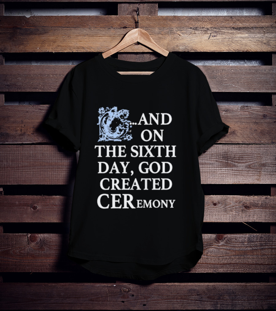 And On The Sixth Day God Created Ceremony Shirt made from 100% pre-shrunk ring-spun cotton, unisex regular fit based on U.S. standard sizing. The shirt is designed, cut, sewn, and printed in the United States. Available in sizes S-5XL.