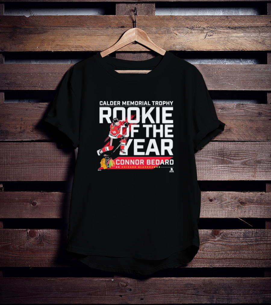 Connor Bedard Calder Memorial Trophy Rookie of the Year 98 Chicago Blackhawks Shirt made from 100% pre-shrunk ring-spun cotton, unisex regular fit based on U.S. standard sizing. The shirt is designed, cut, sewn, and printed in the United States. Available in sizes S-5XL.