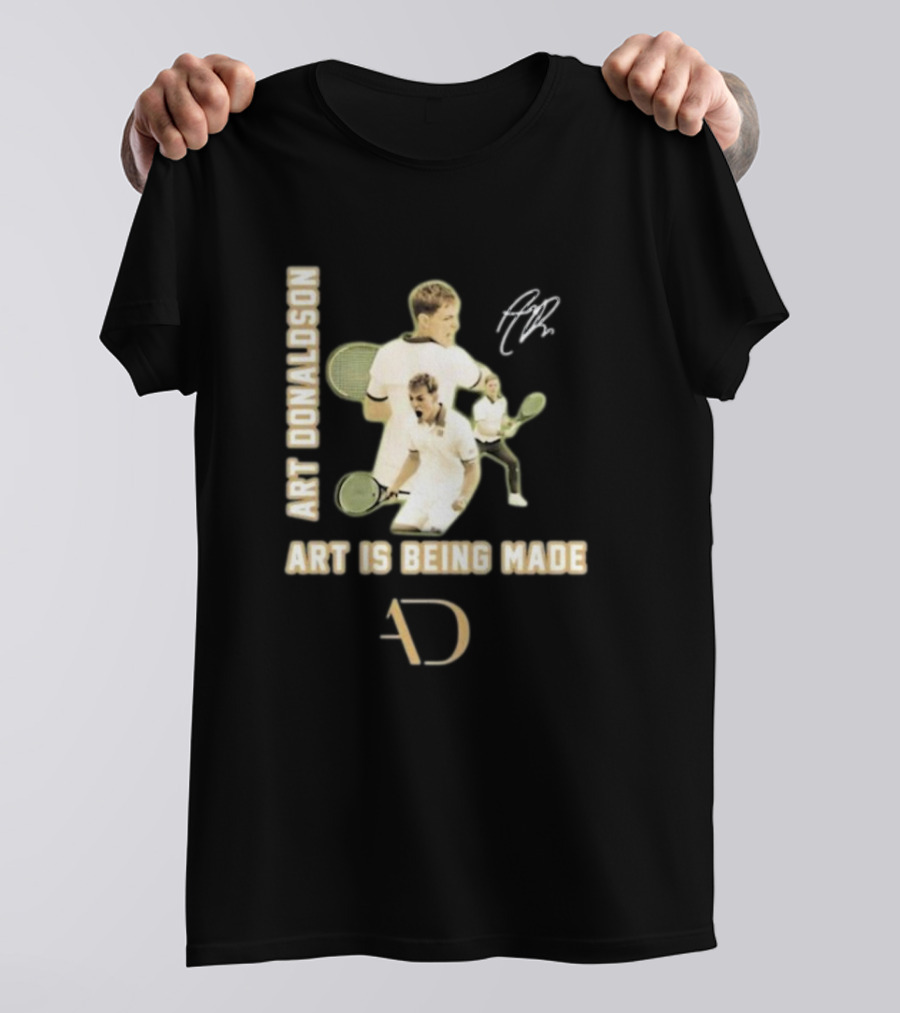 Art Donaldson Tennis Moments Art Is Being Made Shirt made from 100% pre-shrunk ring-spun cotton, unisex regular fit based on U.S. standard sizing. The shirt is designed, cut, sewn, and printed in the United States. Available in sizes S-5XL.