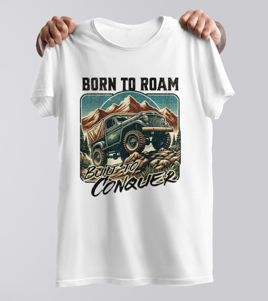 Born To Roam Built To Conquer Vintage Adventure Off-Road Truck Mountains Shirt made from 100% pre-shrunk ring-spun cotton, unisex regular fit based on U.S. standard sizing. The shirt is designed, cut, sewn, and printed in the United States. Available in sizes S-5XL.