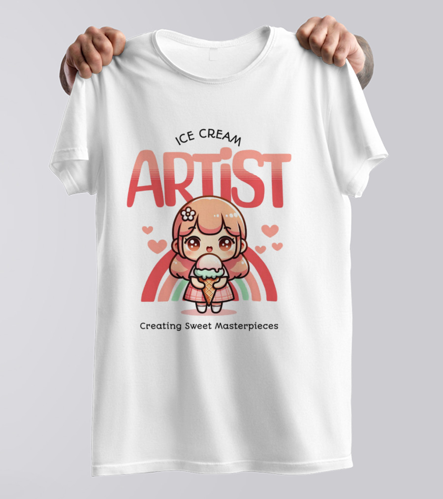 Ice Cream Artist Creating Sweet Masterpieces Kawaii Girl with Hearts and Rainbow Shirt made from 100% pre-shrunk ring-spun cotton, unisex regular fit based on U.S. standard sizing. The shirt is designed, cut, sewn, and printed in the United States. Available in sizes S-5XL.