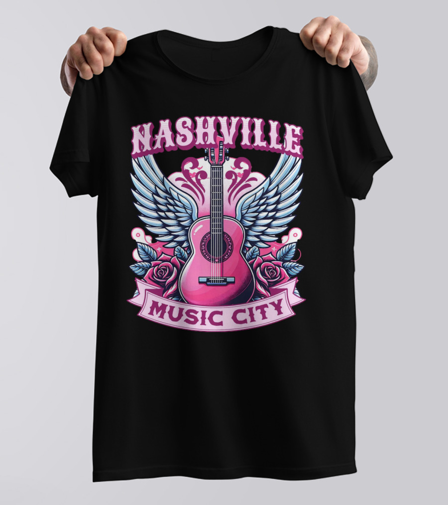 Nashville Music City Pink Guitar Wings Roses T-Shirt