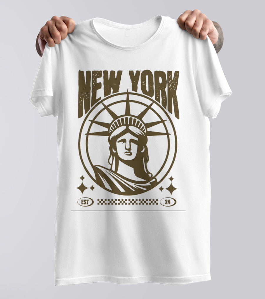 New York Statue of Liberty EST 24 Shirt made from 100% pre-shrunk ring-spun cotton, unisex regular fit based on U.S. standard sizing. The shirt is designed, cut, sewn, and printed in the United States. Available in sizes S-5XL.