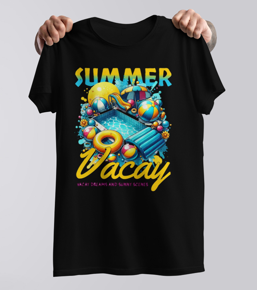 Summer Vacay Dreams and Sunny Scenes Pool Party Shirt made from 100% pre-shrunk ring-spun cotton, unisex regular fit based on U.S. standard sizing. The shirt is designed, cut, sewn, and printed in the United States. Available in sizes S-5XL.