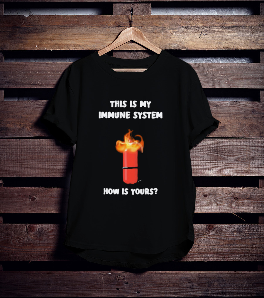 This Is My Immune System Burning Capsule How Is Yours Shirt made from 100% pre-shrunk ring-spun cotton, unisex regular fit based on U.S. standard sizing. The shirt is designed, cut, sewn, and printed in the United States. Available in sizes S-5XL.