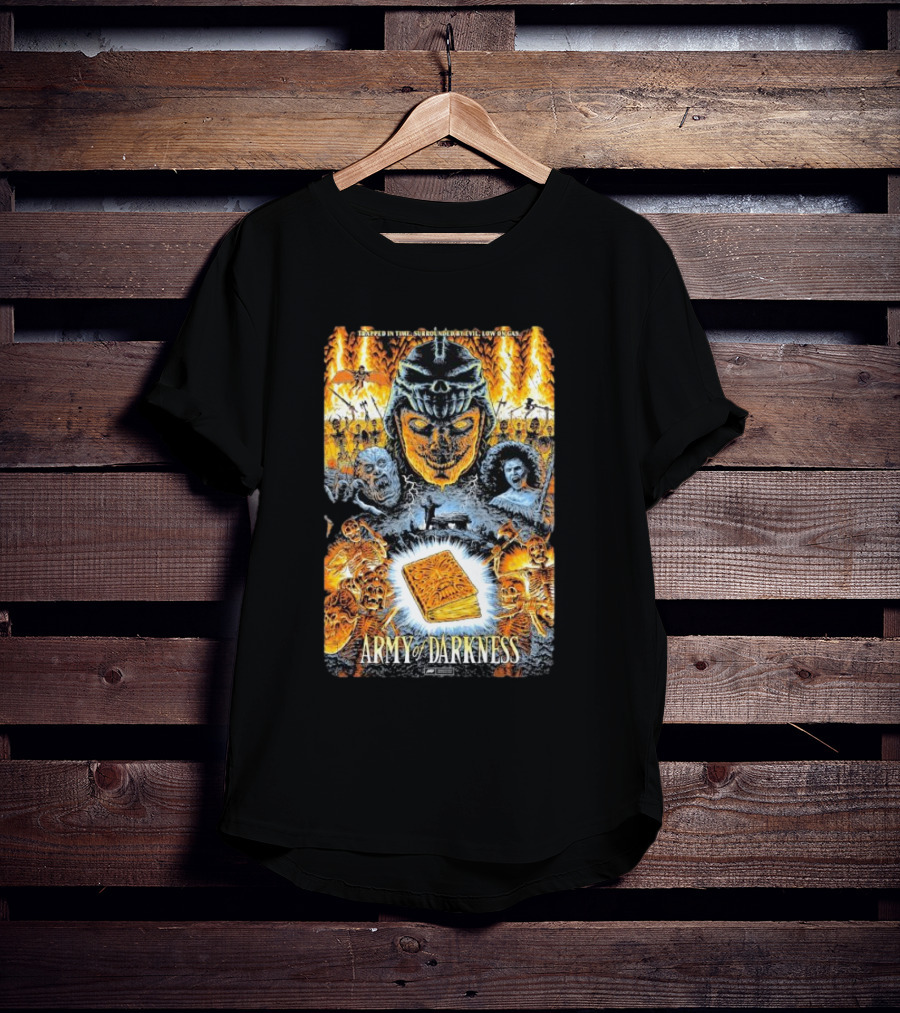 Trapped In Time Surrounded By Evil Low On Gas Army Of Darkness Necronomicon Evil Dead Horror Collage Shirt made from 100% pre-shrunk ring-spun cotton, unisex regular fit based on U.S. standard sizing. The shirt is designed, cut, sewn, and printed in the United States. Available in sizes S-5XL.