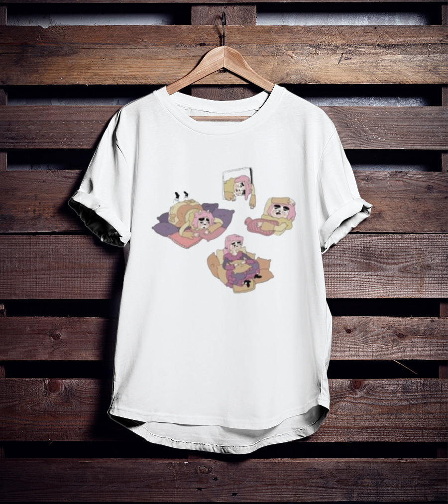Weekend Susie Cozy Relaxation Scenes with Pink Hair Girl Relaxing on Pillows and Chair Shirt made from 100% pre-shrunk ring-spun cotton, unisex regular fit based on U.S. standard sizing. The shirt is designed, cut, sewn, and printed in the United States. Available in sizes S-5XL.