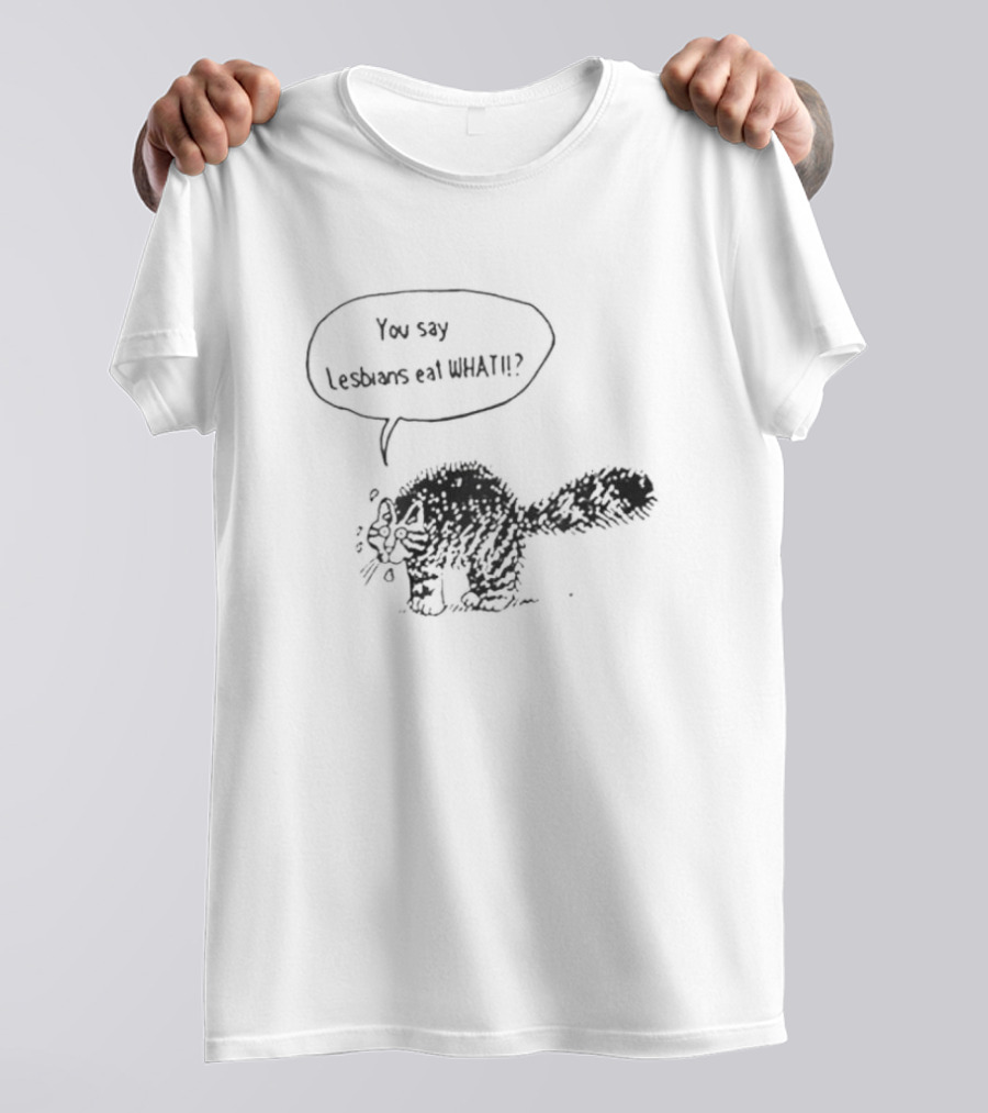 Cat You Say Lesbians Eat What Shirt made from 100% pre-shrunk ring-spun cotton, unisex regular fit based on U.S. standard sizing. The shirt is designed, cut, sewn, and printed in the United States. Available in sizes S-5XL.