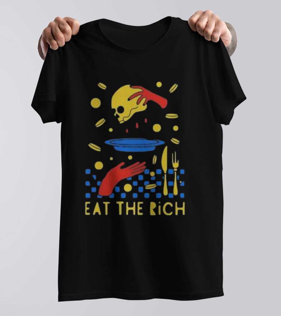 Eat The Rich Skull and Table Setting with Red Hands Shirt made from 100% pre-shrunk ring-spun cotton, unisex regular fit based on U.S. standard sizing. The shirt is designed, cut, sewn, and printed in the United States. Available in sizes S-5XL.