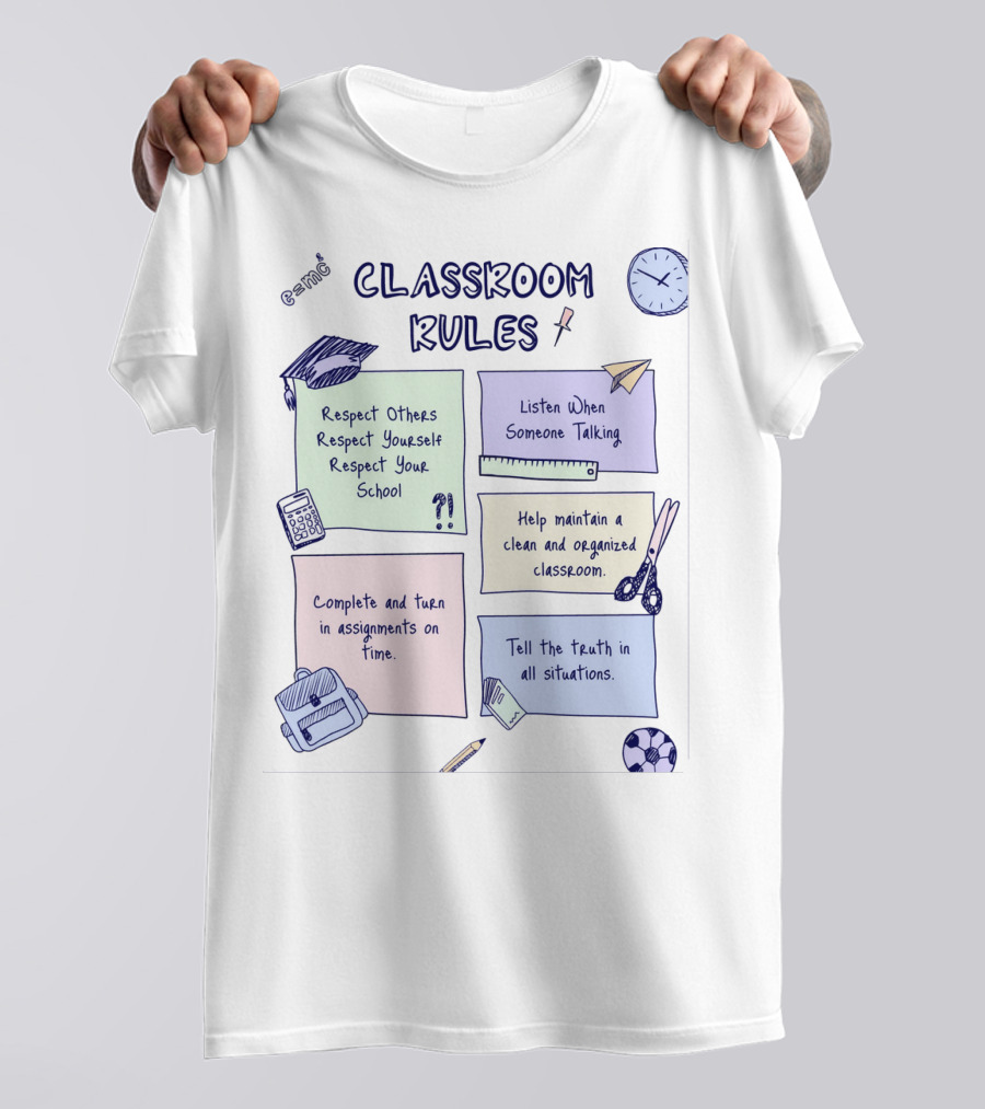 Respect Others, Listen When Someone Talking, Complete Assignments On Time, Organized Classroom, Truth in All Situations Shirt made from 100% pre-shrunk ring-spun cotton, unisex regular fit based on U.S. standard sizing. The shirt is designed, cut, sewn, and printed in the United States. Available in sizes S-5XL.